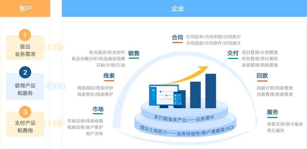 營銷管理——線索管理——機會管理——合同管理——交付管理——回款管理——服務管理,